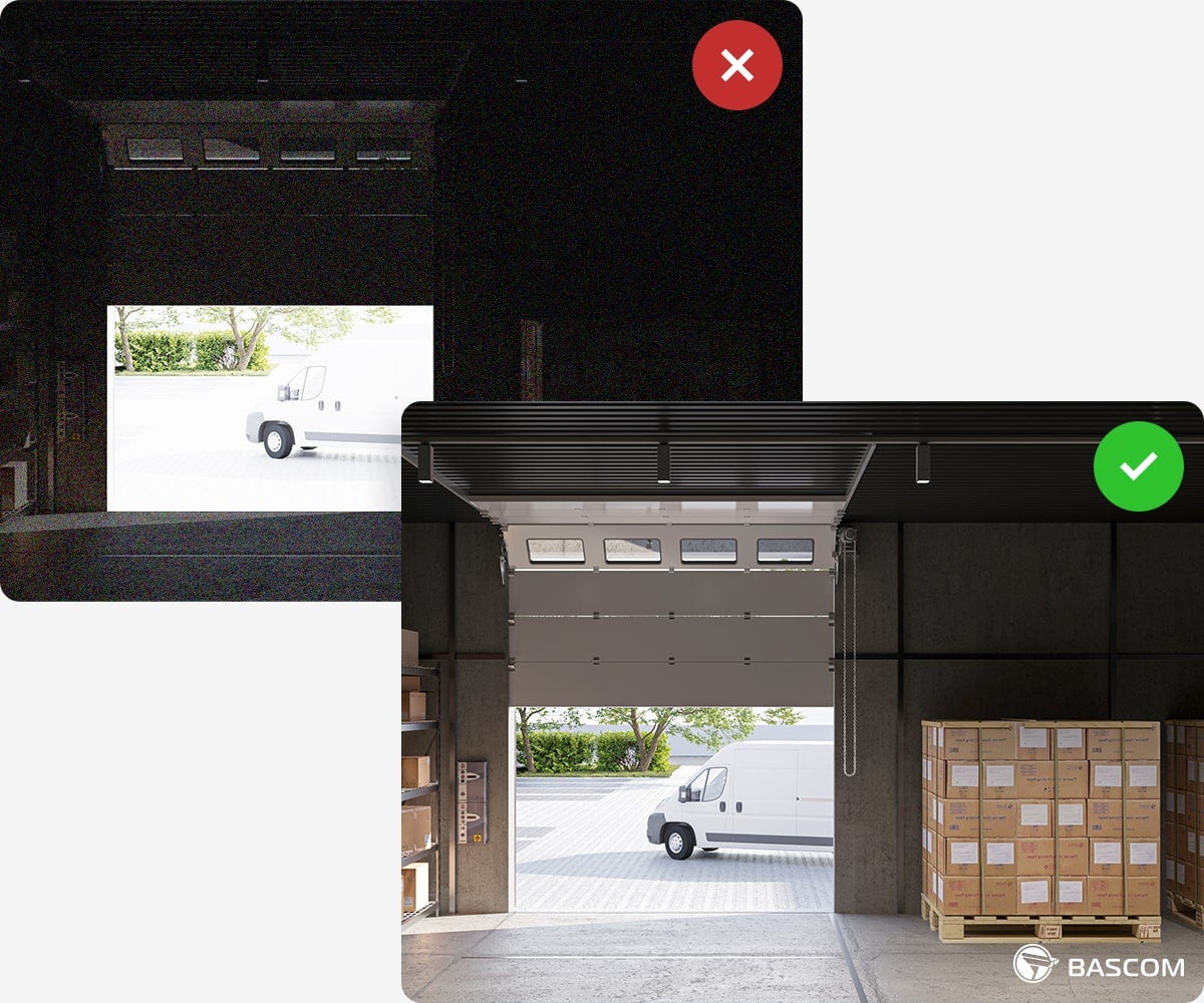 Når det blir mørkt, aktiveres automatisk nattmodus i Bascom PLUS-kameraene. Denne bruker avansert infrarød teknologi og gir klart bilde selv i totalt mørke, opptil 50 meters rekkevidde, der det menneskelige øyet ikke ser noe som helst.