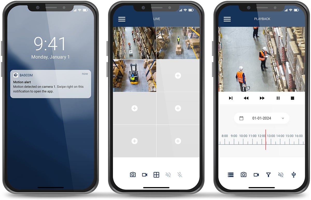 Med Bascoms mobilapp har du tilgang til kameraene dine uansett hvor du befinner deg. Appen er enkel å bruke: skann QR-koden på opptakeren, og du er tilkoblet. Du kan se livebilder, søke i opptak og lage sikkerhetskopier. Appen støtter flere systemer samtidig, slik at du får full oversikt.