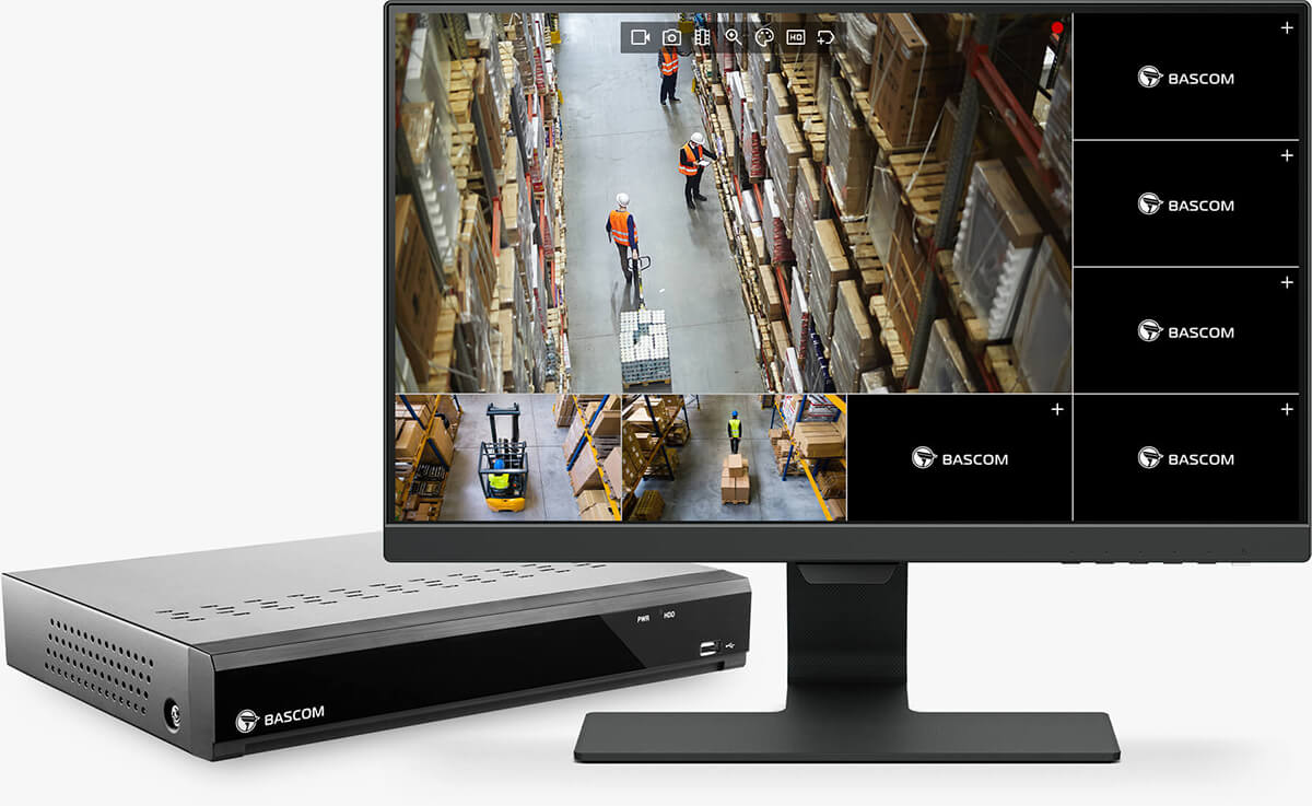 Denne skjermen er vårt anbefalte valg for bruk med et Bascom-kamerasystem. Du kobler den enkelt til opptakeren med den medfølgende HDMI-kabelen. Deretter kan du se livebilder fra kameraene – helt uten å koble systemet til internett. Systemet styres med musen som følger med opptakeren.