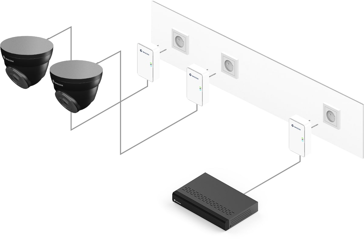 Dette kamerasystemet er utstyrt med Bascom® POWER, vår banebrytende teknologi for å sende videostrøm via strømnettet. Du plugger bare kameraene inn i en stikkontakt, og de kobler seg automatisk til opptakeren via de eksisterende strømkablene i bygget. Resultatet er en stabil, kabellignende tilkobling, uten behov for trekking av egne kabler.