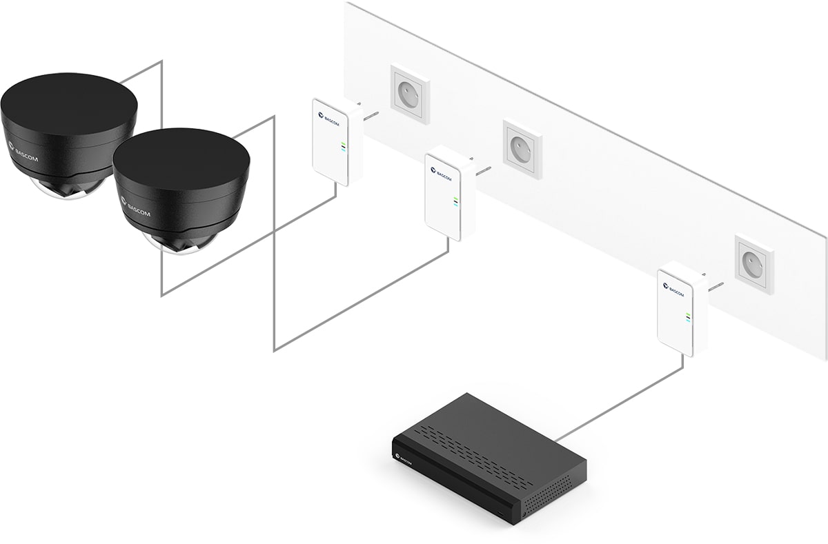 Dette kamerasystemet er utstyrt med Bascom® POWER, vår banebrytende teknologi for å sende videostrøm via strømnettet. Du plugger bare kameraene inn i en stikkontakt, og de kobler seg automatisk til opptakeren via de eksisterende strømkablene i bygget. Resultatet er en stabil, kabellignende tilkobling, uten behov for trekking av egne kabler.