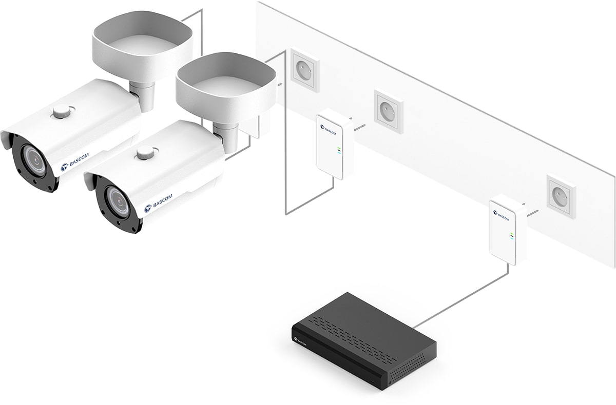 Dette kamerasystemet er utstyrt med Bascom® POWER, vår banebrytende teknologi for å sende videostrøm via strømnettet. Du plugger bare kameraene inn i en stikkontakt, og de kobler seg automatisk til opptakeren via de eksisterende strømkablene i bygget. Resultatet er en stabil, kabellignende tilkobling, uten behov for trekking av egne kabler.