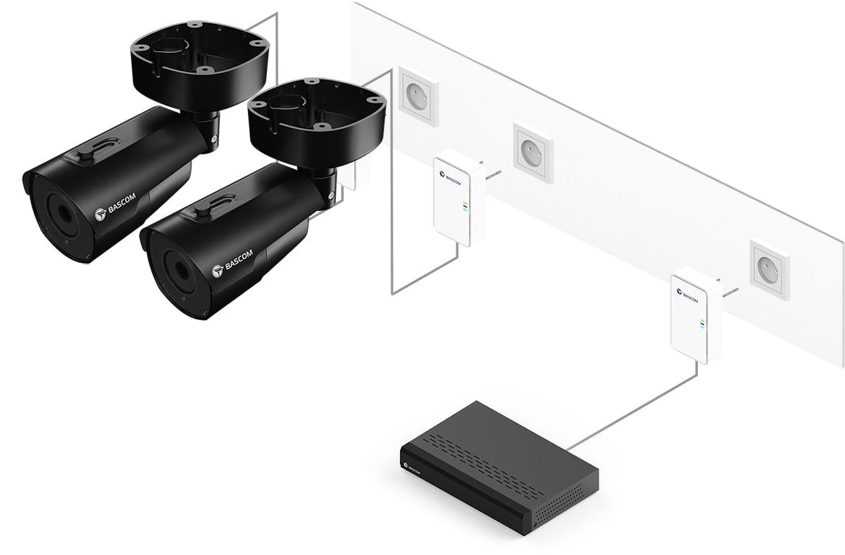 Dette kamerasystemet er utstyrt med Bascom® POWER, vår banebrytende teknologi for å sende videostrøm via strømnettet. Du plugger bare kameraene inn i en stikkontakt, og de kobler seg automatisk til opptakeren via de eksisterende strømkablene i bygget. Resultatet er en stabil, kabellignende tilkobling, uten behov for trekking av egne kabler.